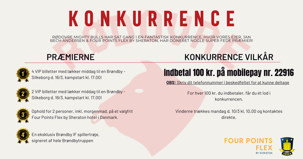 Rødovre Mighty Bulls har sat gang i en fantastisk konkurrence, hvor vores ejer, Jan Bech Andersen & Four Points Flex by Sheraton, har doneret nogle super fede præmier!