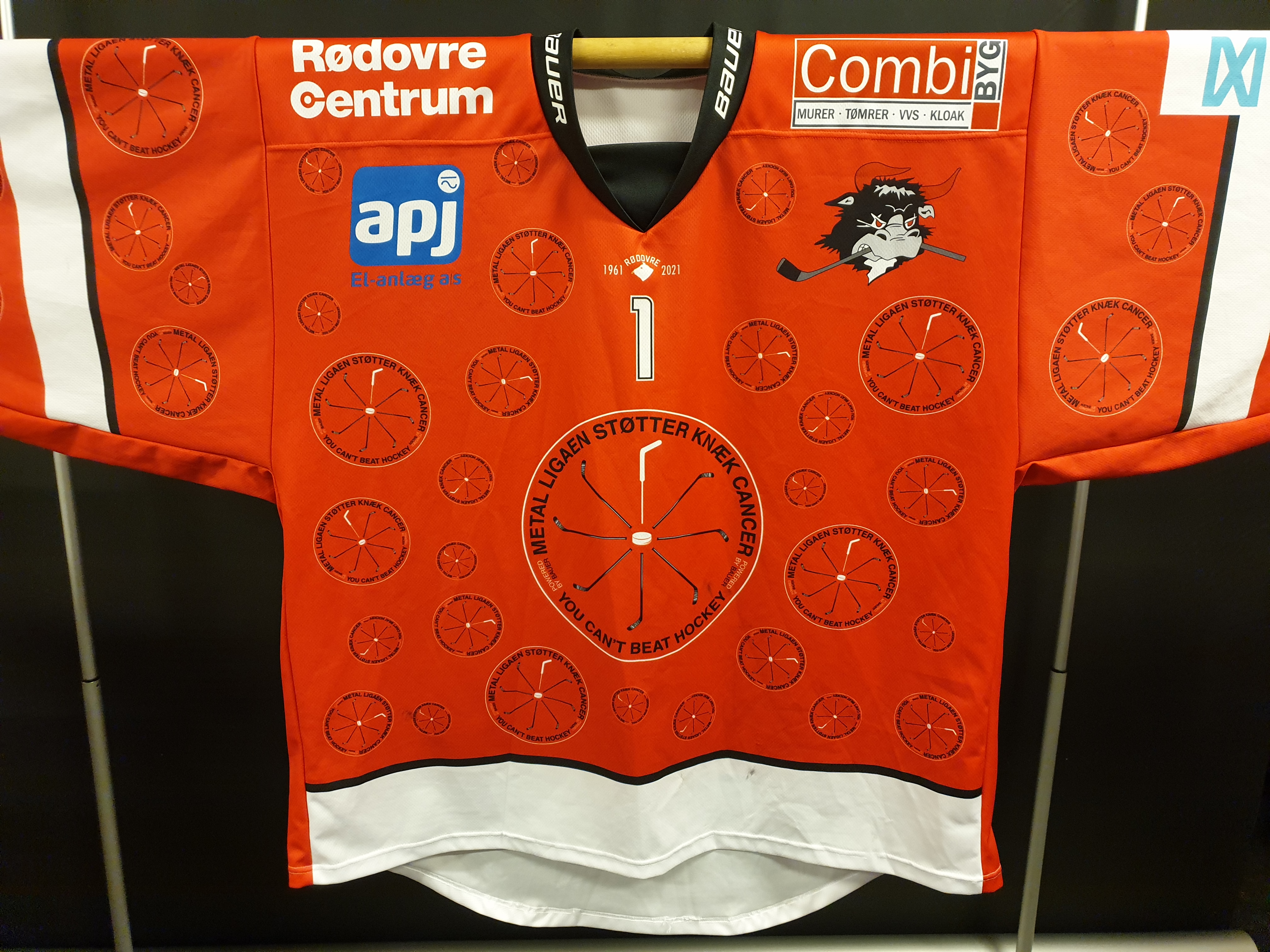 Mandag aften spillede Rødovre Mighty Bulls i særlige Knæk Cancer-trøjer, som nu auktioneres bort til fordel for den gode sag.